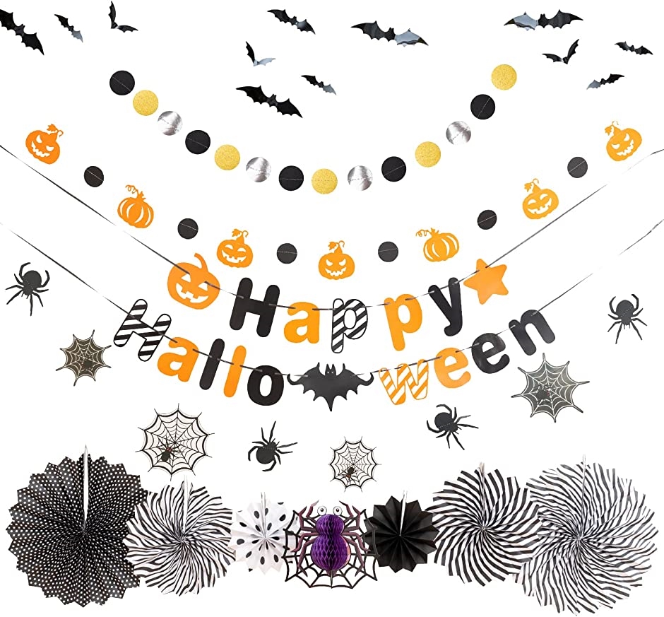 ハロウィン 飾り 23点セット ガーランド 飾り付け 装飾 バナー かぼちゃ くも こうもり パーティー グッズ( なし, なし)・ハロウィンの飾り付けセットです。ハロウィンだけでなく、誕生日や各種パーティーなどいろいろな用途でお使いいただけます。・ご自宅でも店舗でも使用可能なボリューム感。全部で23点セット。華やかに演出できます。・バルーンは膨らませるのが大変。手間なくお子様でも簡単に楽しく飾り付けができます。(HappyHalloweenガーランドは紐を通す必要があります。紐と紐通しが付属されています。穴がくりぬかれていないものがありましたら、慎重に取り除いてください。)・セット内容 ペーパーファン6pc、蜘蛛の巣ガーランド、金銀黒〇ガーランド、かぼちゃガーランド、HappyHalloweenガーランド、こうもりステッカー12枚・翌年も使えてエコ。バルーンは一度膨らませたら終わりですが、こちらの商品は紙製品なので再利用できます。(こうもりステッカーはPVC素材です。両面テープが付属していますが、翌年以降は新しいものを張ってお使いください。) ¥2,680 |